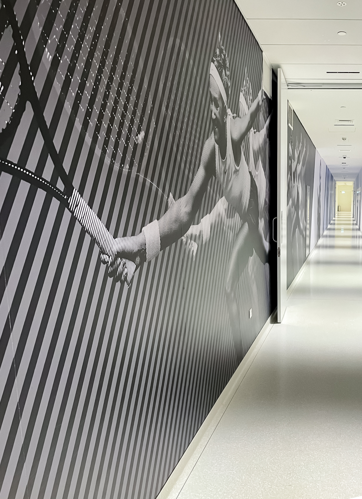 Tout au long de son parcours au sein de la Rafa Nadal Academy, le visiteur est immergé dans l’univers du tennis. De grands panneaux figuratifs, mettant en scène des champions en mouvement, habillent les couloirs et créent une dynamique de circulation. La référence à la balle de tennis est convoquée dans le mobilier arrondi et jaune qu’on rencontre dans les lounges. Et dans les sanitaires, les teintes murales sont un clin d’oeil aux tournois du Grand Chelem (rouge orangé pour symboliser Roland Garros, vert pour Wimbledon, bleu pour l’US Open ou l’Open d’Australie). Des salles d’entraînement modulaires permettent aux élèves de l’académie de pratiquer toutes les disciplines nécessaires (biking studio, boxe, yoga, stretching, etc).